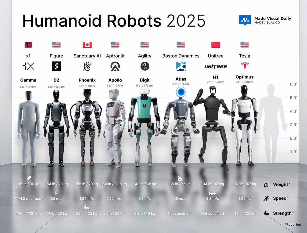 На инфографике представлены ключевые игроки отрасли: X1 Gamma, Figure 02, Unitree H1, Tesla Optimus, Phoenix, Apollo, Digit и Atlas.